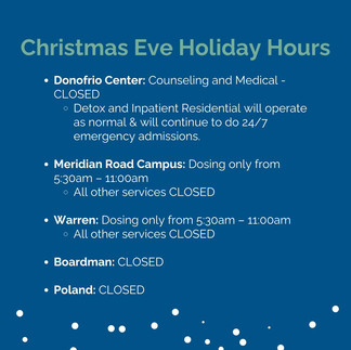 While some of our locations may be closed in celebration of the holidays, The Donofrio Center remains open and is admitting new patients 24/7 — providing hope to those who need it most.